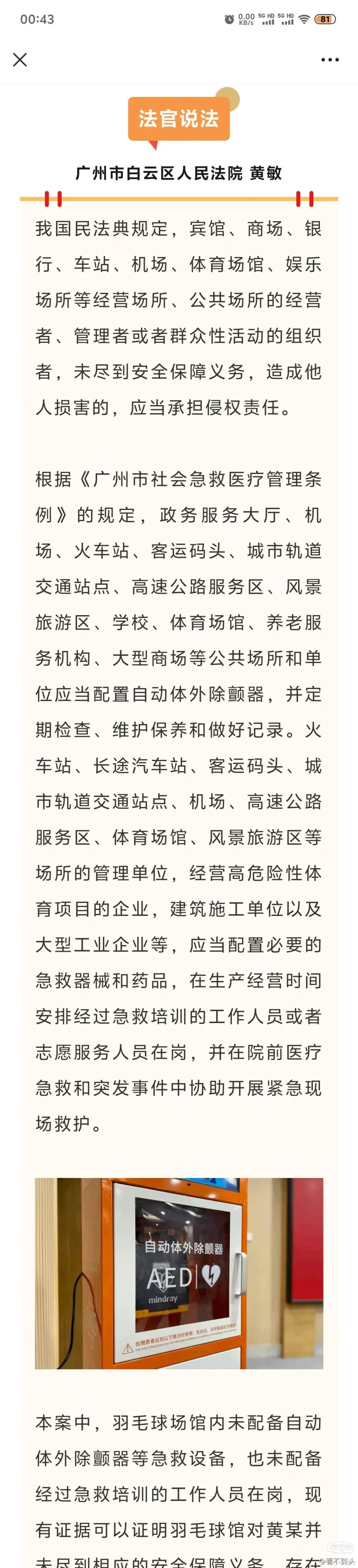如果明文规定了,那也没啥好说的。如果整个广州都没球馆配,那有点倒霉,但也谈不上冤枉。不过羽毛球馆也很赚钱,又是在广州,20w应该是个小意思,或许某一些程度上会提升知名度去的人更多呢,不管怎么说,普及急救措施是以后必须的